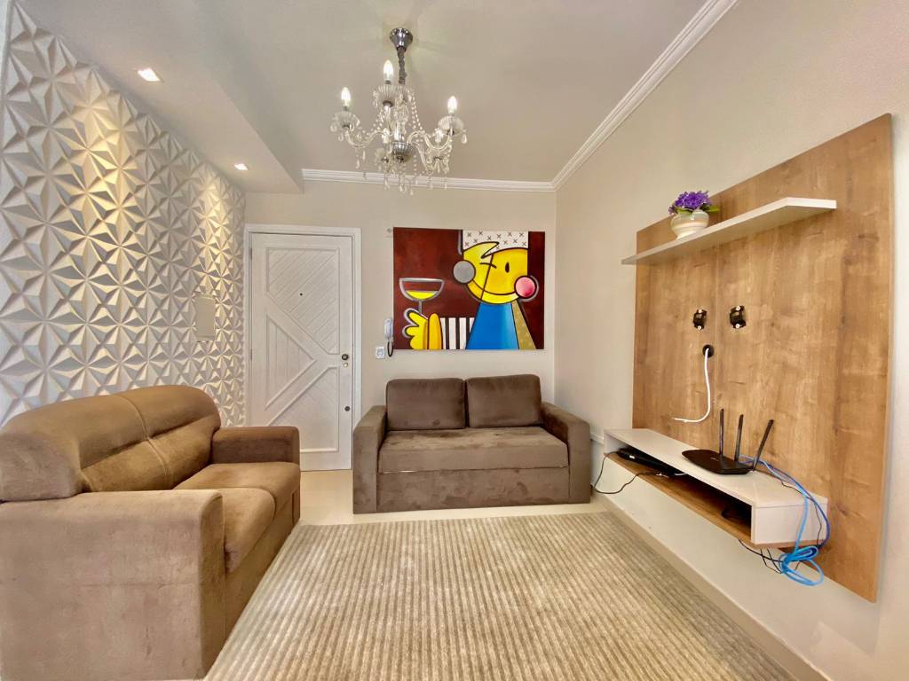 Apartamento mobiliado e decorado, composto por dois dormitórios sendo uma suíte, cozinha estilo americana, sacada com churrasqueira, Split estalado, piso porcelanato, rebaixado em gesso, edifício com elevador, porta e portão eletrônico, zeladoria permanente, localizado a beira mar no centro de Capão da canoa, junto a todos os recursos da cidade