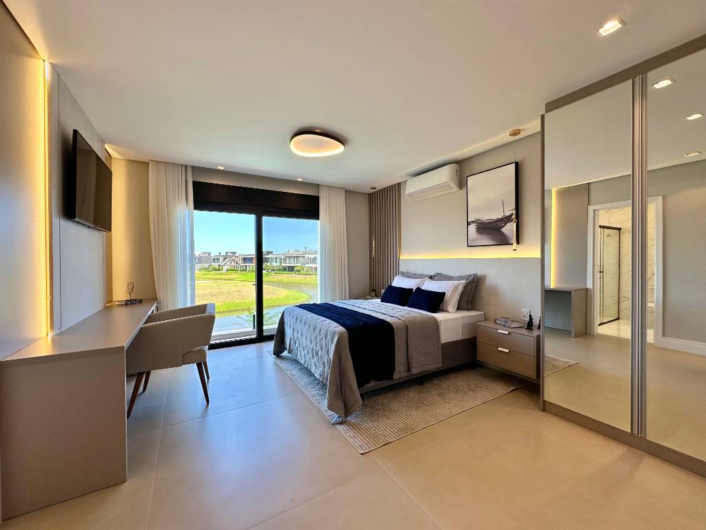 Casa alto padrão, beira lago com 280m2, composto por 04 suítes, sendo 01 master com hidro, lavabo, ambientes integrados, alto padrão de acabamento, piscina de concreto com borda infinita, espera para aquecimento solar, esquadrias internas em PVC, esquadrias externas em PVC preto com persianas automatizadas. Condomínio com infraestrutura completa + infraestrutura náutica com acesso a lagoa! Não perca tempo, agende a sua visita agora mesmo!